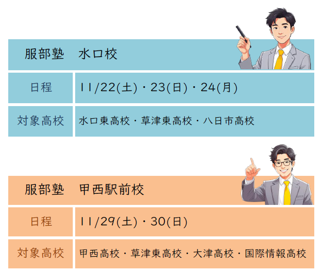 ・高校のテスト日程に合わせて対象を行いますので、高校によって日時が異なる場合があります。詳しくはお問い合わせください。
