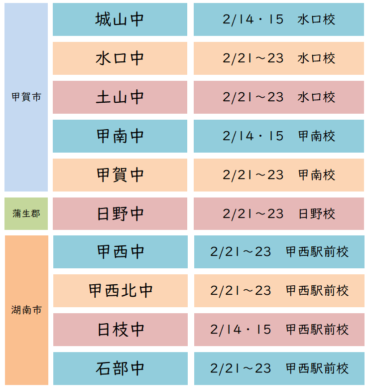 ・詳しい日程や時間、教科は各中学校各学年によって異なりますのでお問い合わせください。