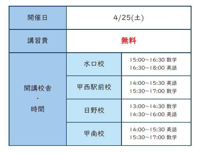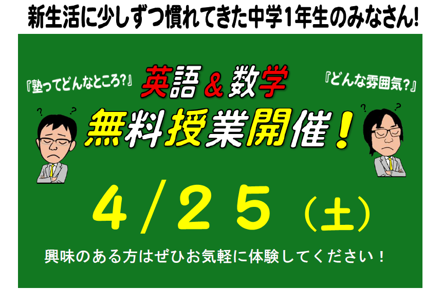 4/25(土) 新中1 英語&数学 無料授業開催!